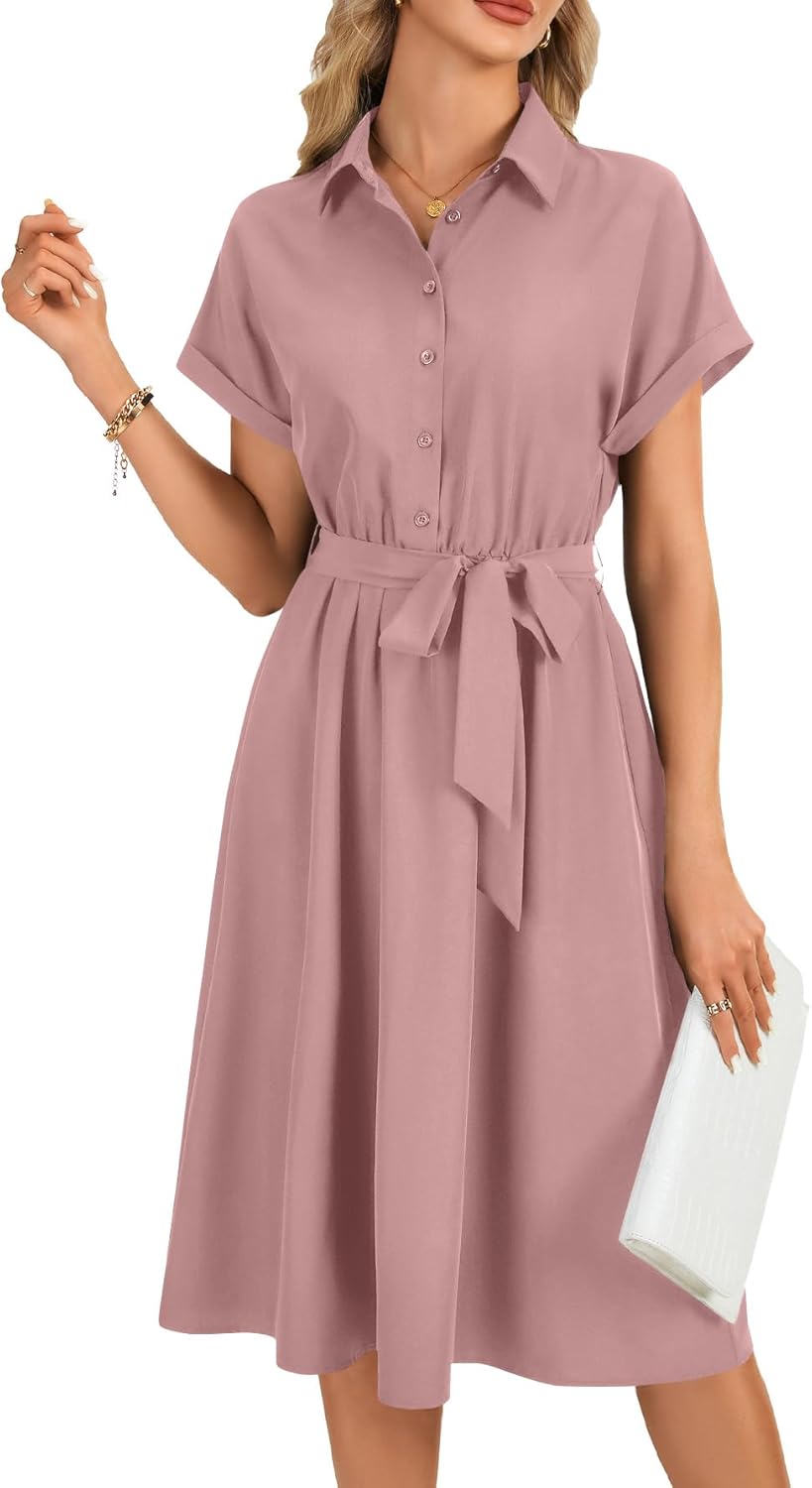 LYANER Women's Collar V Neck Button Front Tie Waist Short Sleeve Ruffle Hem Flowy Midi Dresses Pink# Small