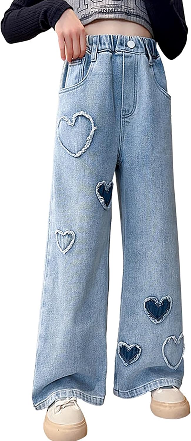 AOWKULAE Girls Jeans Elastic Waist Wide Leg Pants Kids Jeans 4-14 Years