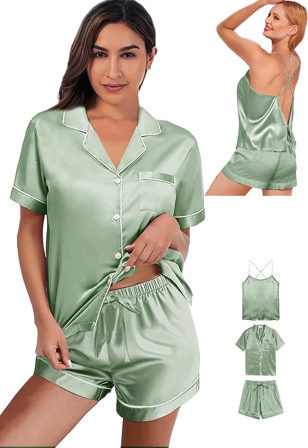 3Pcs Silk Pajamas Set for Women XS-4XL Satin Pajama Lingerie Pjs Cami Tops Silky Pj Sets Sleepwear Nightwear