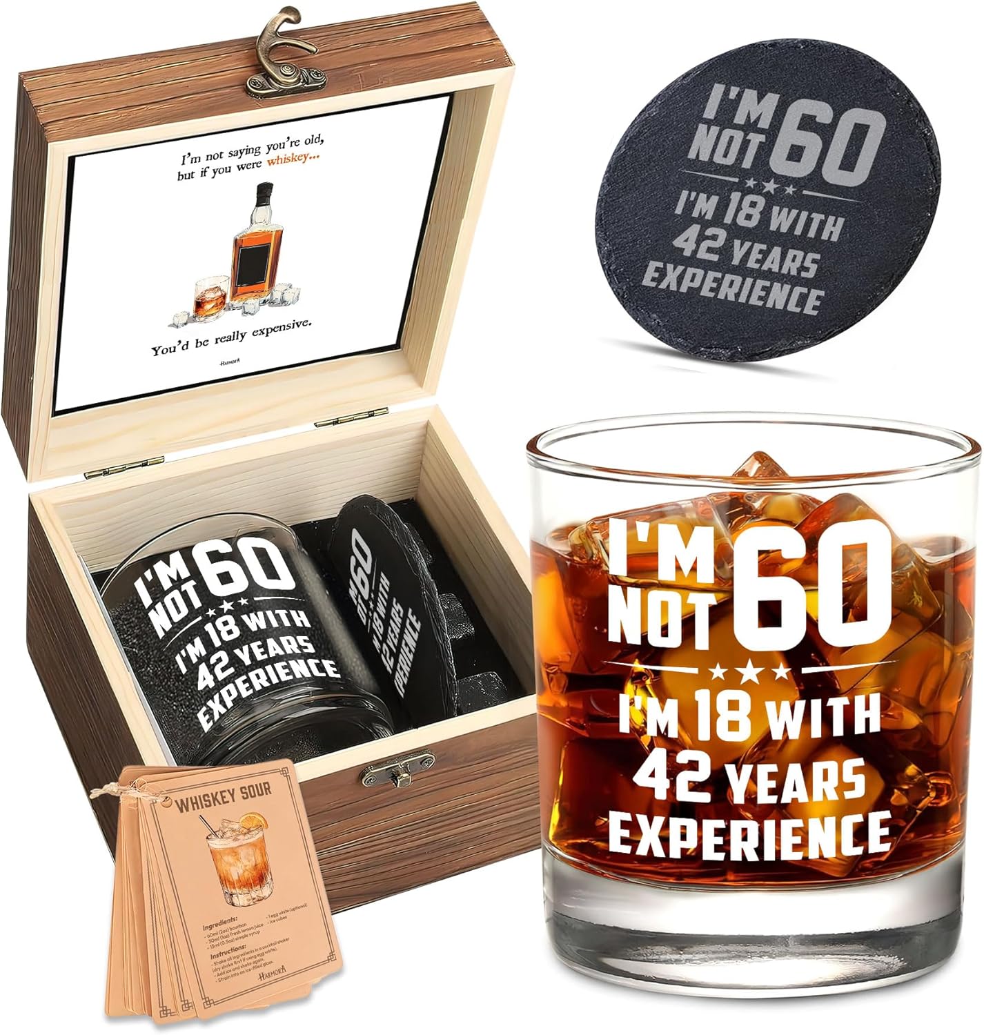 60th Birthday Gifts for Men – Funny Whiskey Glass Set for Him Born in 1966 – 60 Year Old Gift Ideas for Dad, Grandpa, Husband, Friends – Wooden Box, Coaster, Cards