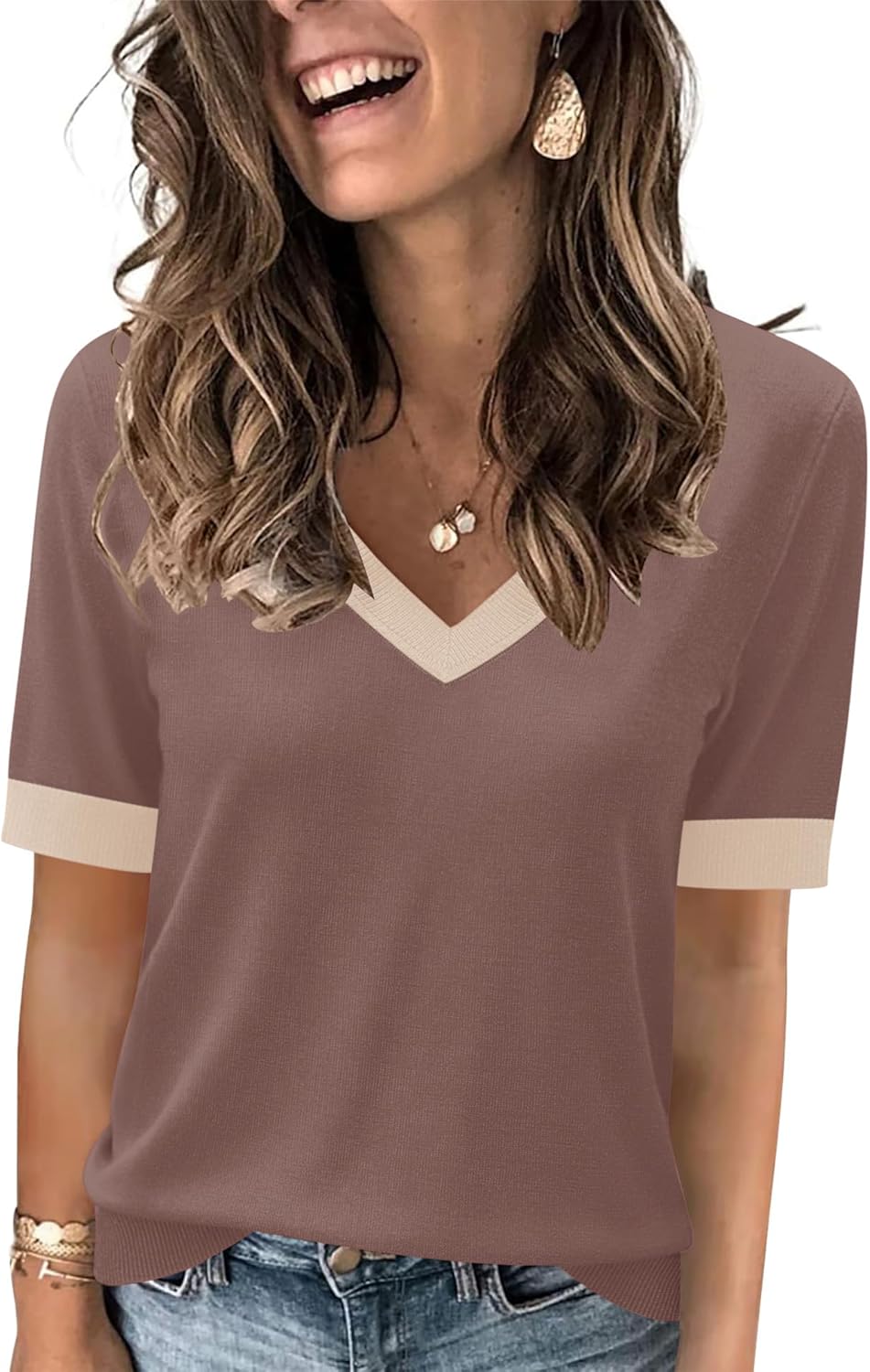 Rapbin Womens Short Sleeve Sweater Summer V Neck Tops Casual Knit Shirts Lightweight Pullover Top