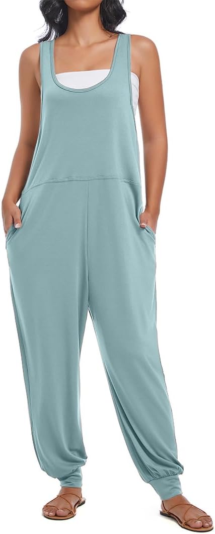 Women's Summer U Neck Jumpsuit Casual Sleeveless Overalls Loose Long Pants Comfortable Rompers with Pockets