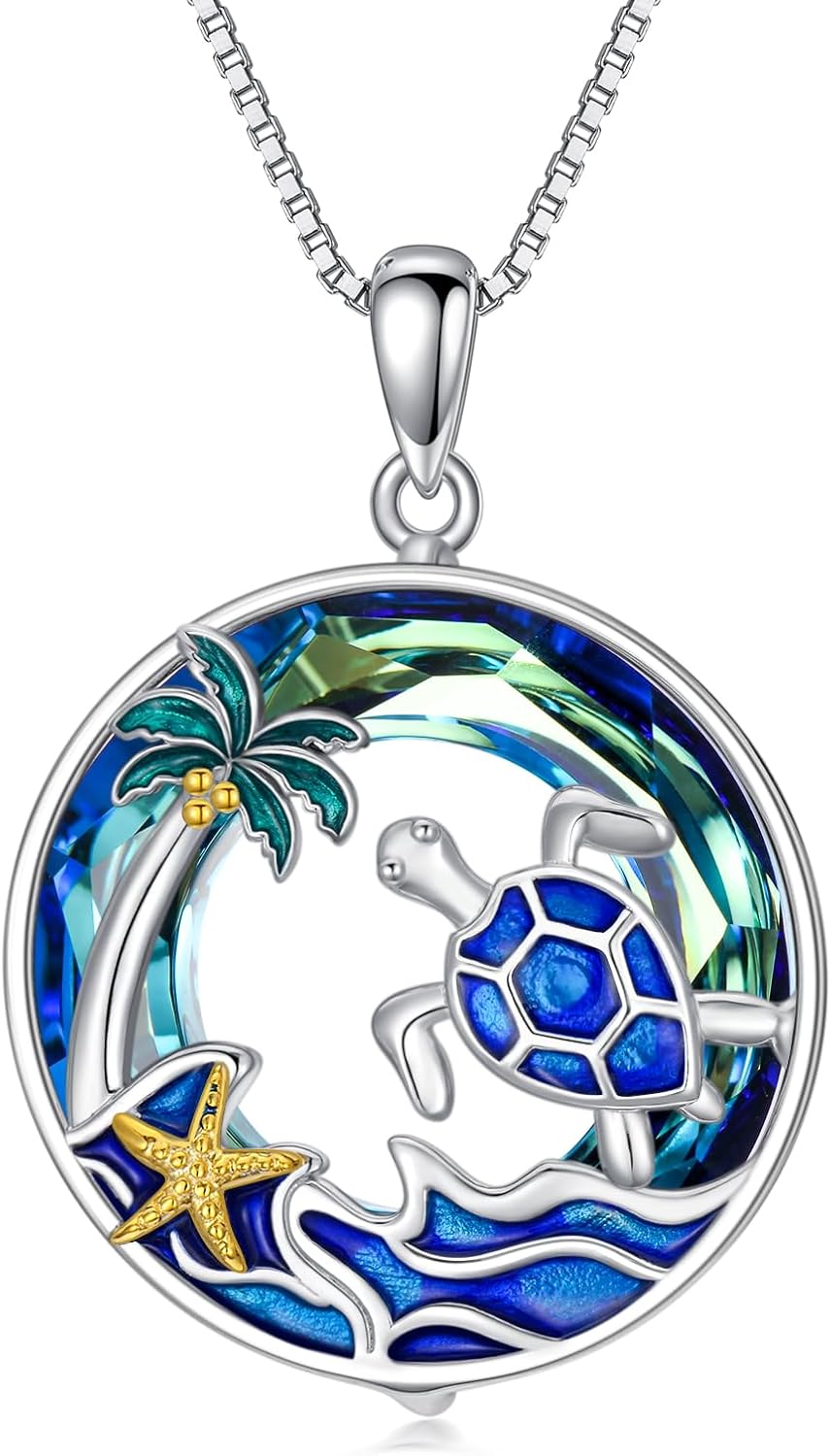 TOUPOP Sea Turtle Gifts Sterling Silver Tropical Palm Tree Ocean Pendant Crystal Sea Turtles Jewelry Christmas Summer Gifts for Women Her