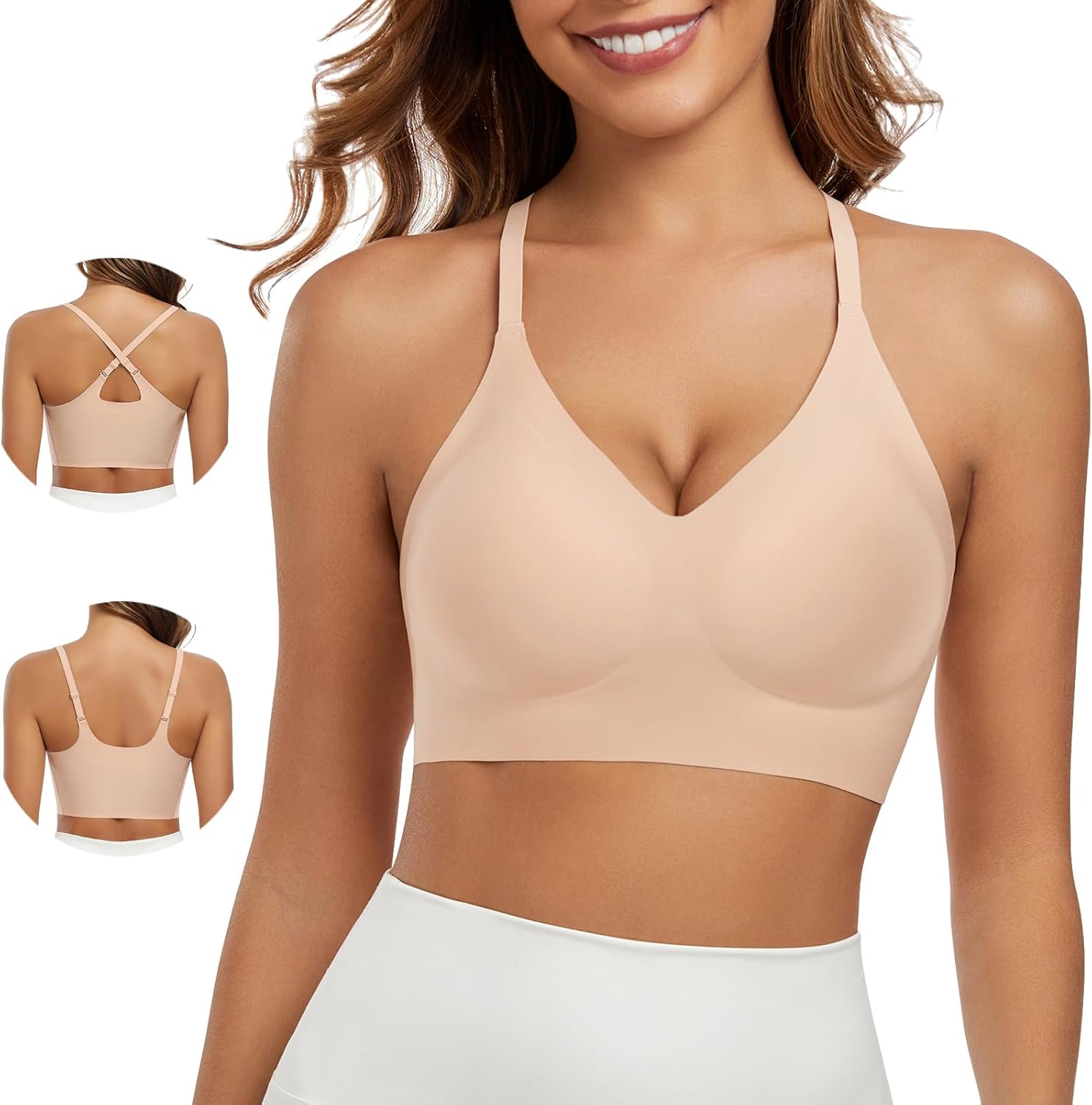 Comfortable Seamless Wireless Racerback Cross Back Pull on Bra V Neck Cami Bralette with Support Sport Everyday Bra