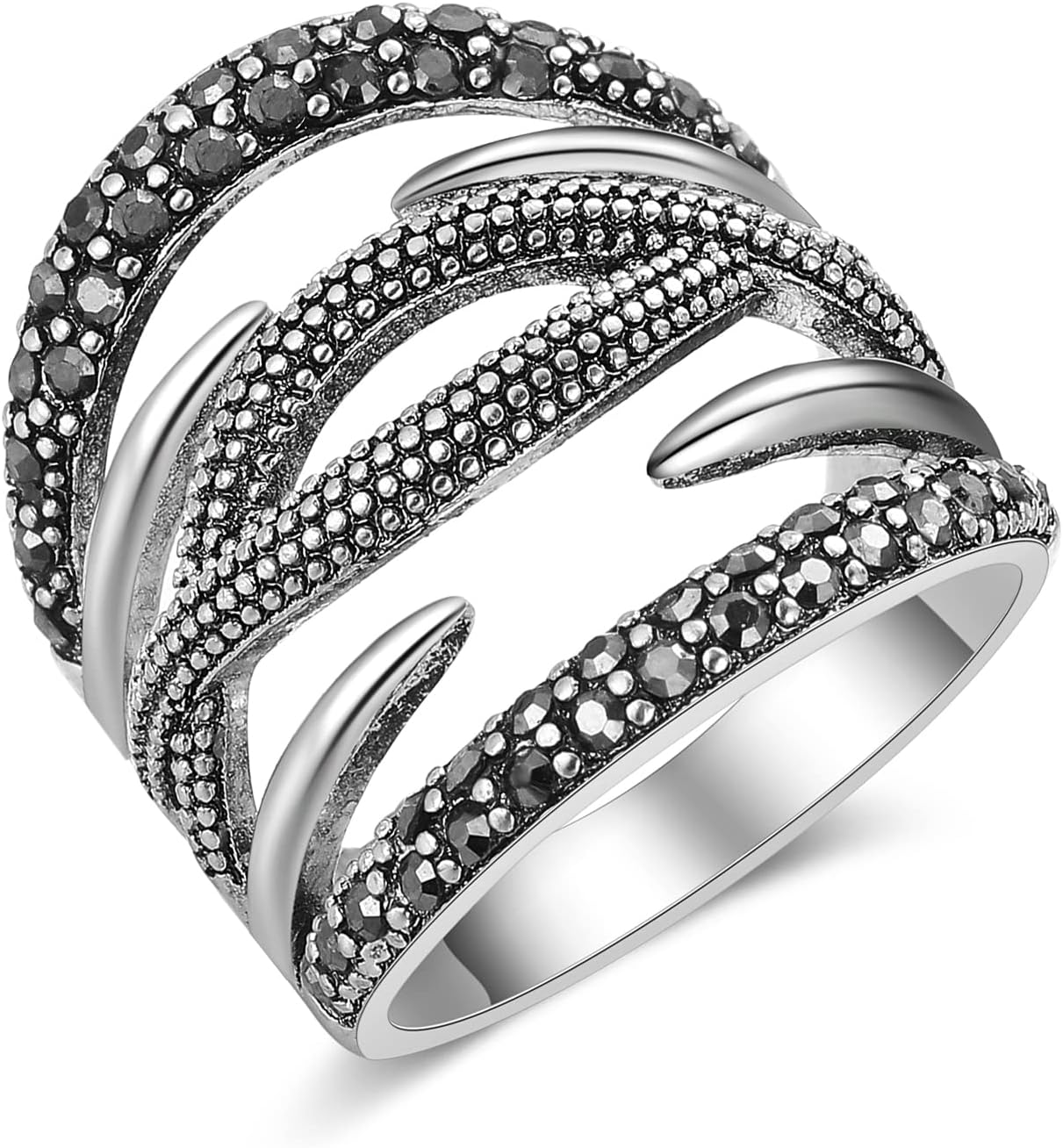 Mytys Black Onyx Stone Rings for Women Marcasite Vintage Cocktail Statement Rings Silver Chunky Crystal Antique Retro for victorians Jewelry Gift