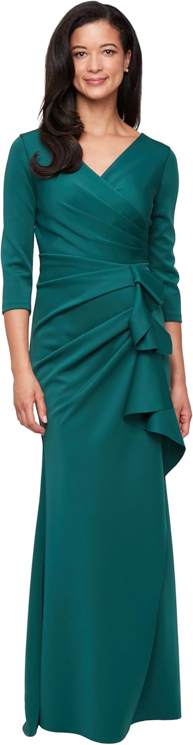 Alex Evenings Womens Stretch Scuba Crepe Dress with Surplice Neckline and Gathered Cascade Detail Skirt, Floor Length