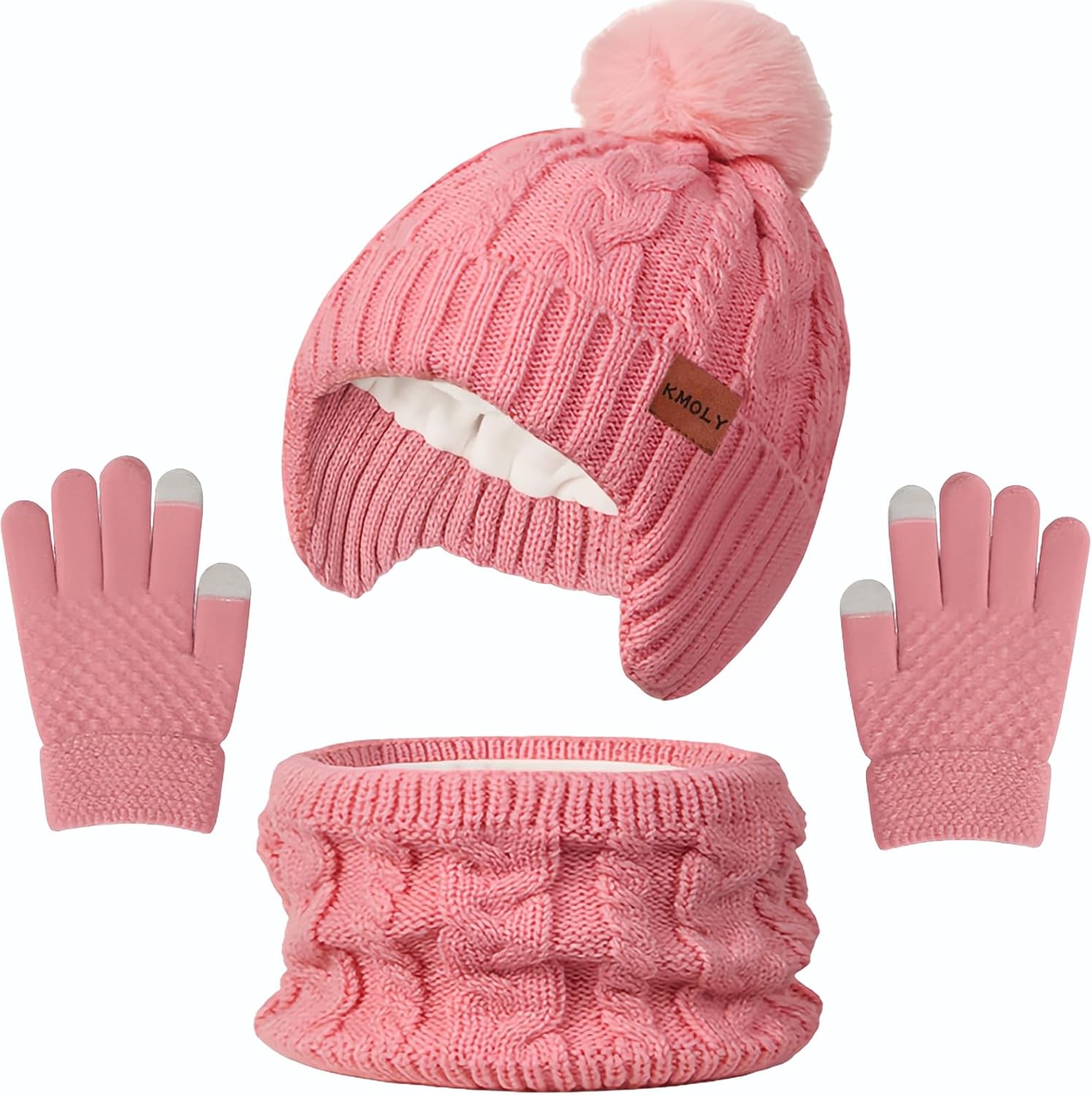 Kids Winter Hat Gloves Scarf Set,Beanie with Pom Earflaps Neck Gaiter Fleece Lined Touchscreen Gloves for Girls Boys 3-10Y
