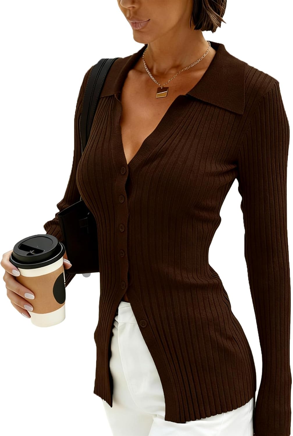 Dressmine Button Up Cardigan Sweaters for Women Long Sleeve Thick Work Sweater Cinched Waist Fitted Spring Clothes