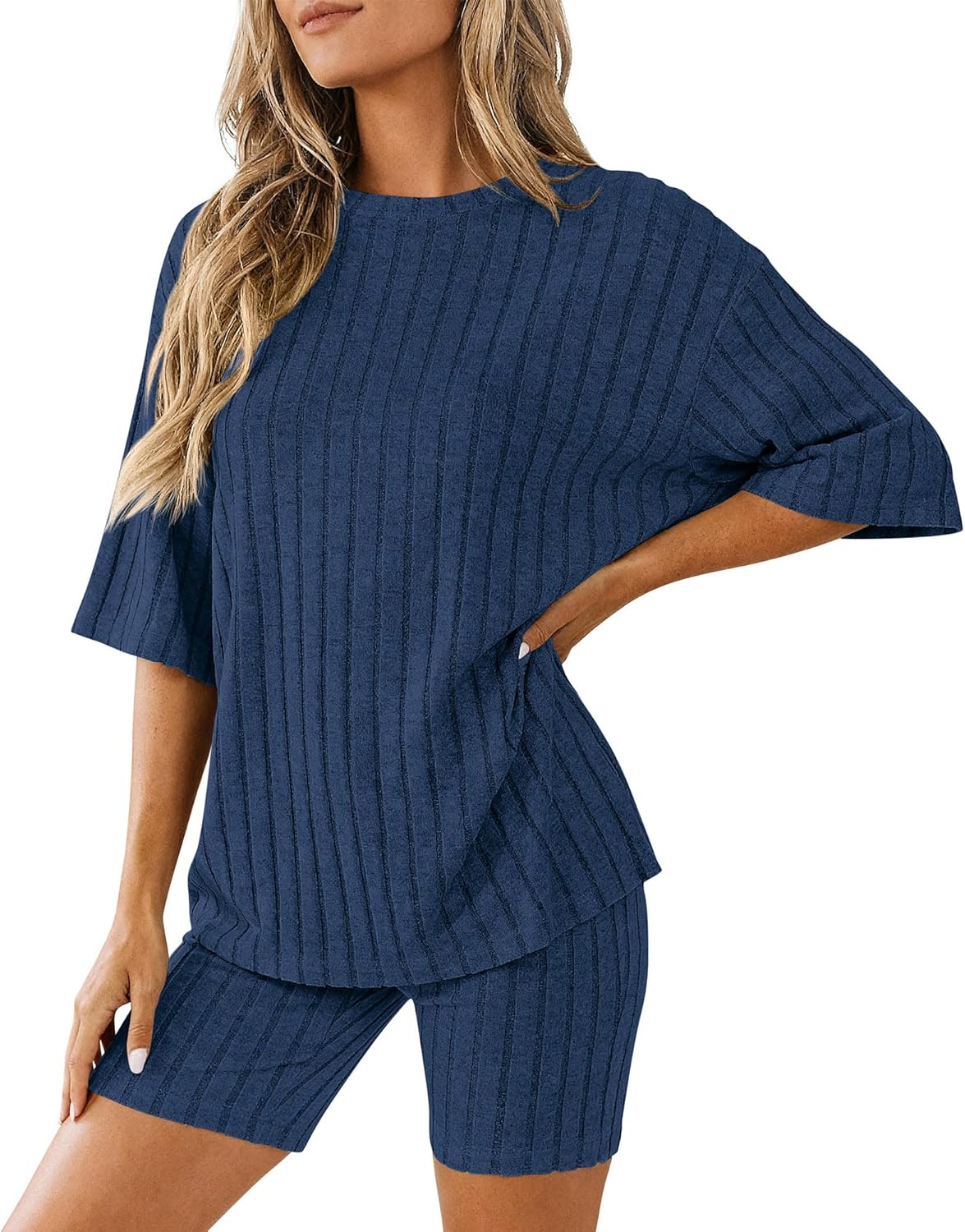 KIRUNDO Lounge Sets For Women 2 Piece Ribbed Knit Shorts Set Casual Short Sleeve Tops Biker Shorts Vacation Cruise Outfits