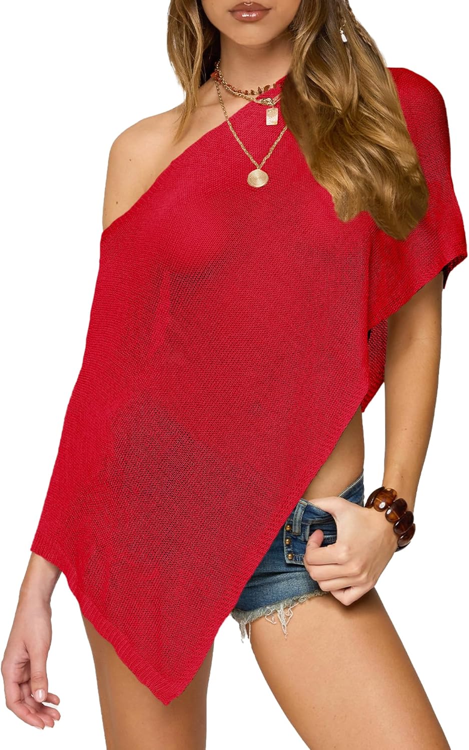 Womens Summer One Shoulder Knit Sheer Poncho Trendy Lightweight Asymmetric Shrug Pullover Sweaters