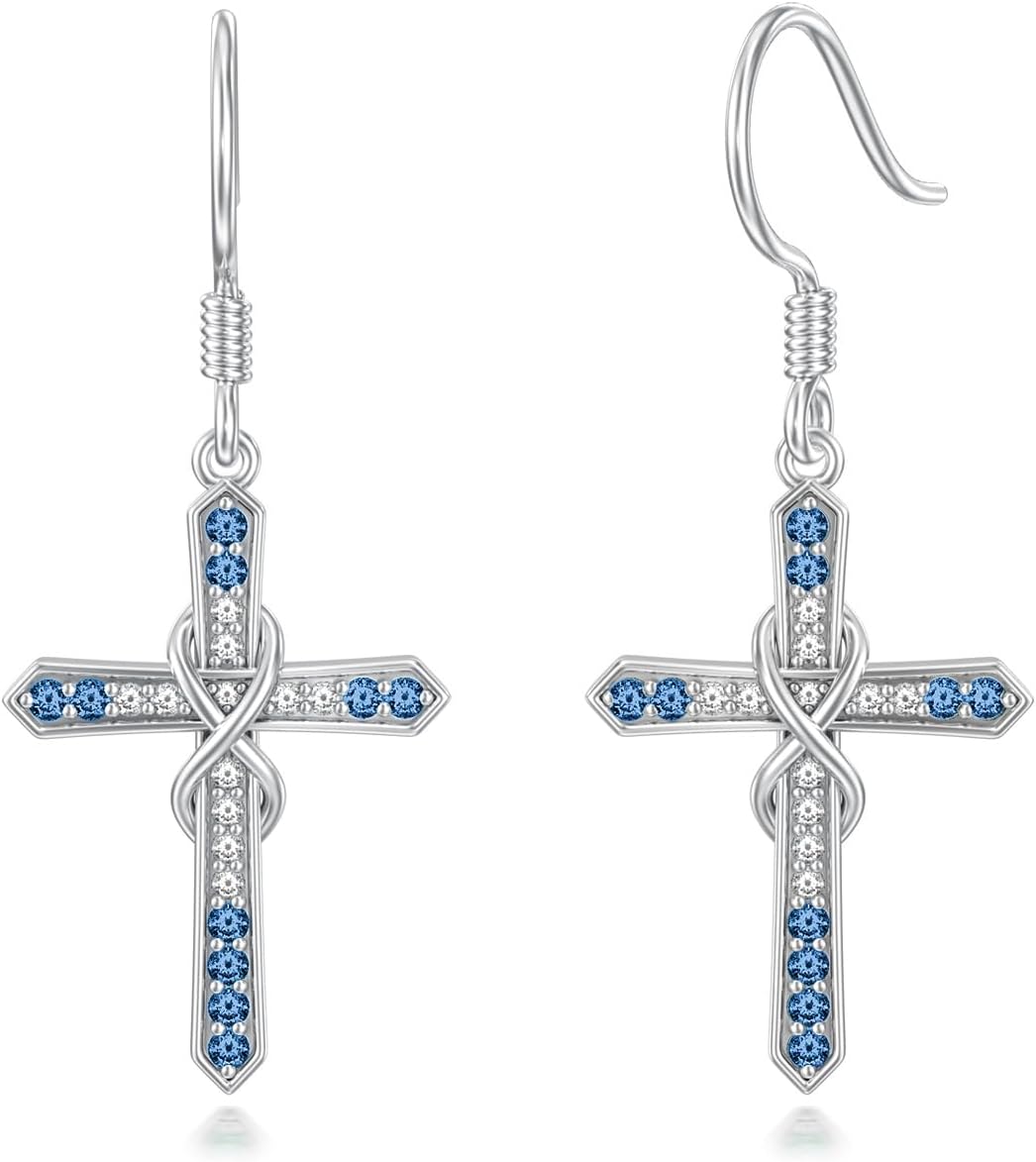 Seiyang Cross Birthstone Earring 925 Sterling Silver Cross Dangle Drop Earrings with 12 Months Birthstone Religious Christian Jewelry Gifts for Women Mom Her