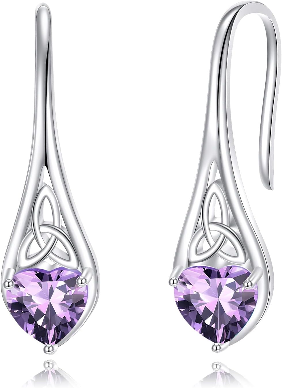 Celtic Earrings 925 Sterling Silver Trinity Knot Hook Dangle Drop Earrings with 6mm Heart Birthstones Jewelry Gifts for Women Her