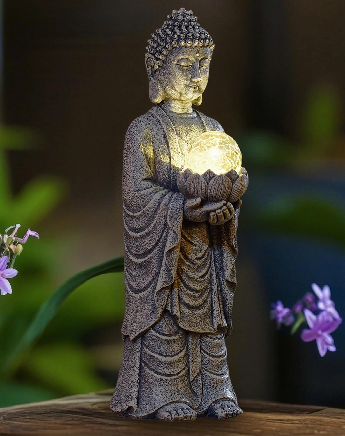- Solar Buddha Statue:Illuminate your outdoor space with this serene Buddha statue, perfect for gardens, patios, or pathways.The built-in solar light creates a calming glow at night