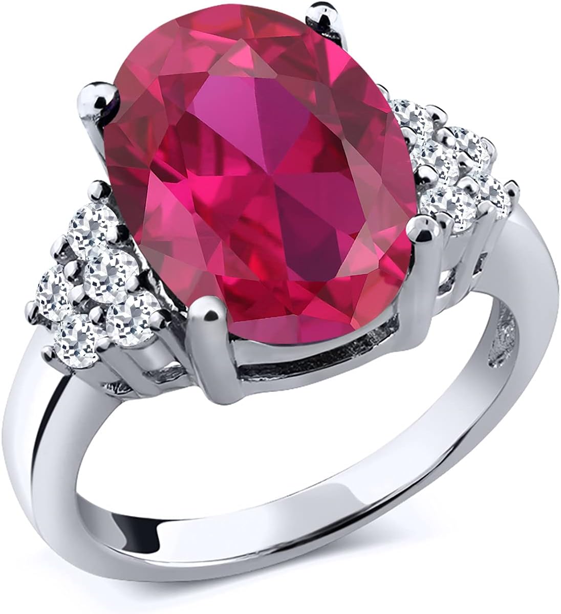 Gem Stone King 5.40 Cttw Red Created Ruby and White Topaz Engagement Ring For Women | 925 Sterling Silver | Oval 12X10MM | Wedding Engagement Anniversary Promise Ring For Women