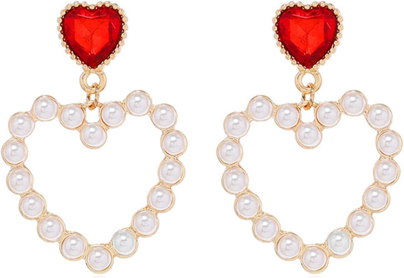 WCRAZYE Pearl Heart Earrings for Women Girls Dainty Handmade Gold Pearl Red Diamond Love Heart Shape Dangling Drop Tassel Earrings Gift Valentine's Day Christmas
