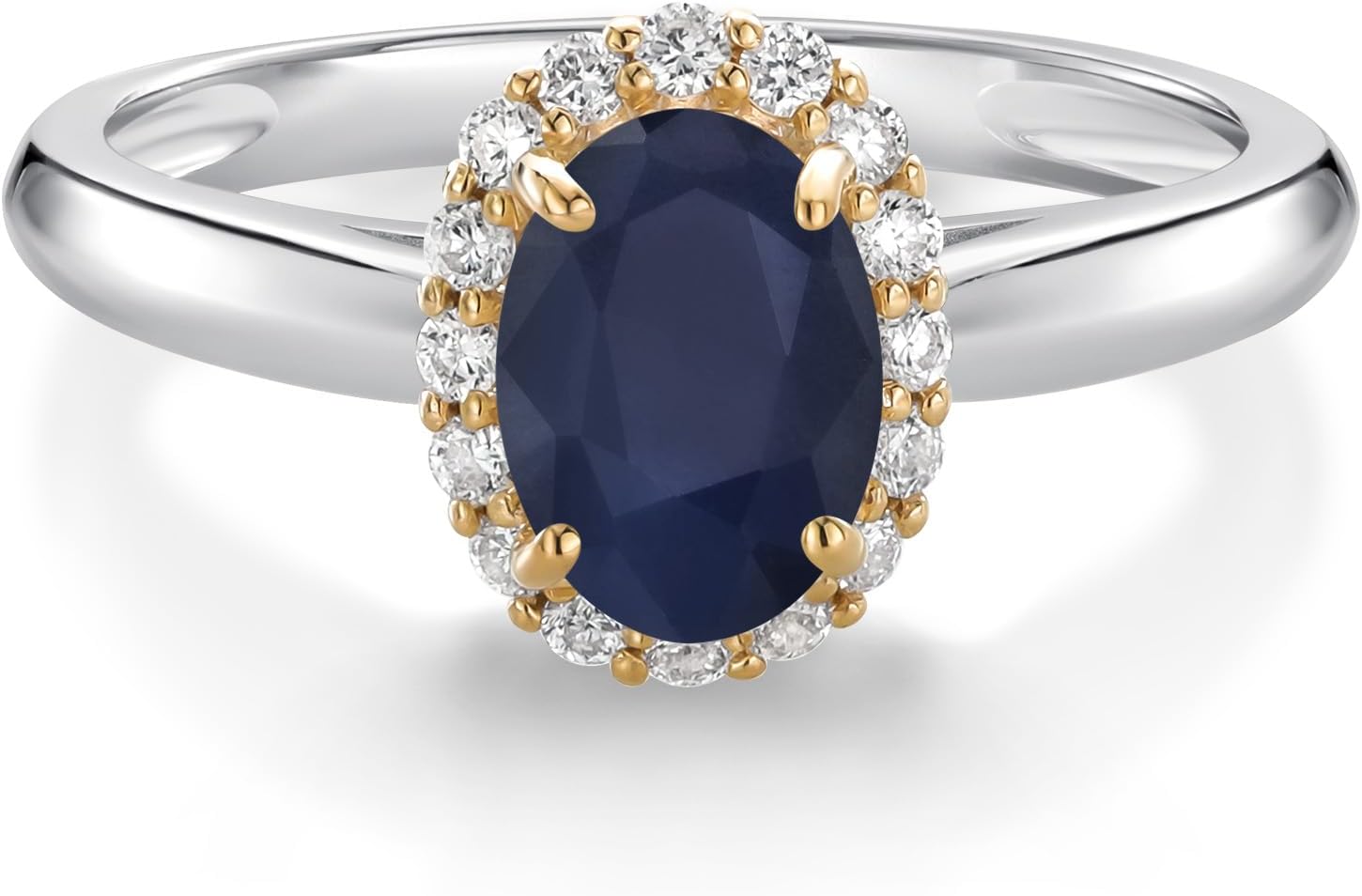Gem Stone King 1.13 Cttw Blue Sapphire and White Lab Grown Diamond Halo Engagement Ring For Women | 925 Sterling Silver and 10k Yellow Gold |Oval 7X5MM | Wedding Anniversary Promise Ring