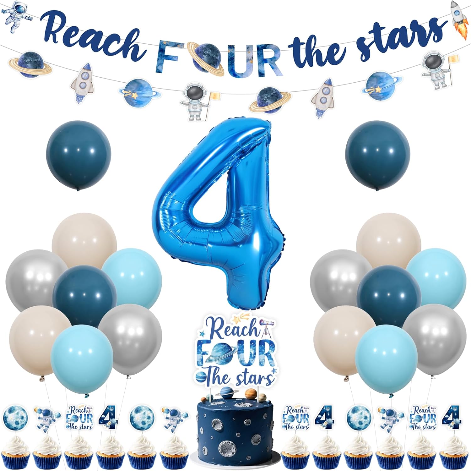 - Package Includes: 1 Reach four the stars banner, 1 outer space garland, 1 reach four the stars cake topper, 12 outer space 4th birthday cupcake toppers, 1 number 4 foil balloon 32 inches, 16 latex balloons and 2 ribbons.