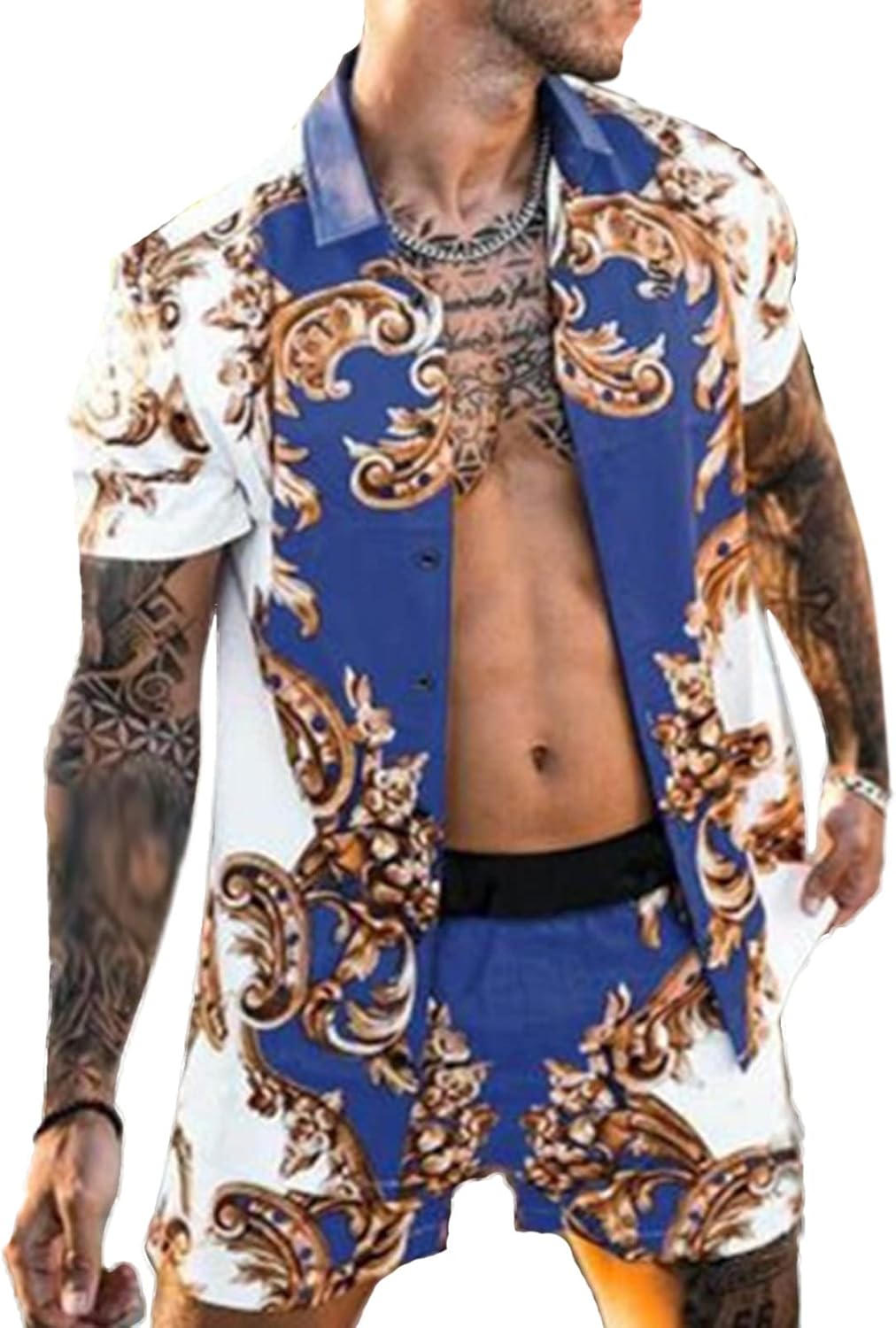 Men's Hawaiian Sets Short Sleeve Luxury Print Casual Button Down Dress Shirt Top and Shorts