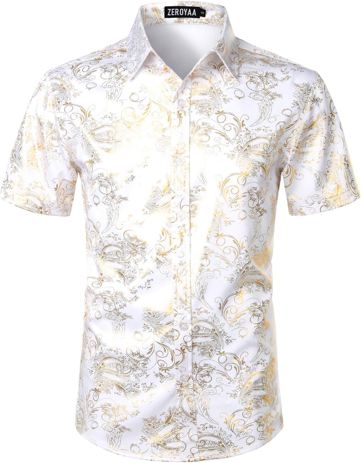 ZEROYAA Men's Luxury Paisley Shiny Printed Slim Fit Short Sleeve Button Up Dress Shirt