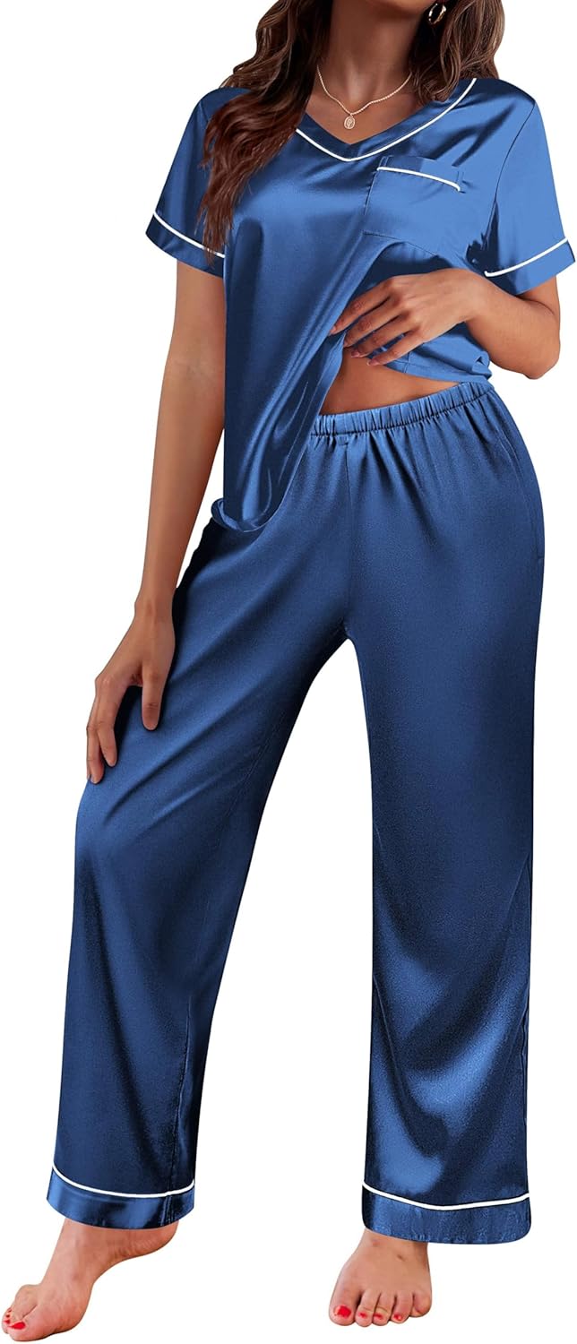 Ekouaer Satin Pajamas for Women Short Sleeve Silk Pajama Sets Soft Sleepwear Top with Causal Long Pj Pant