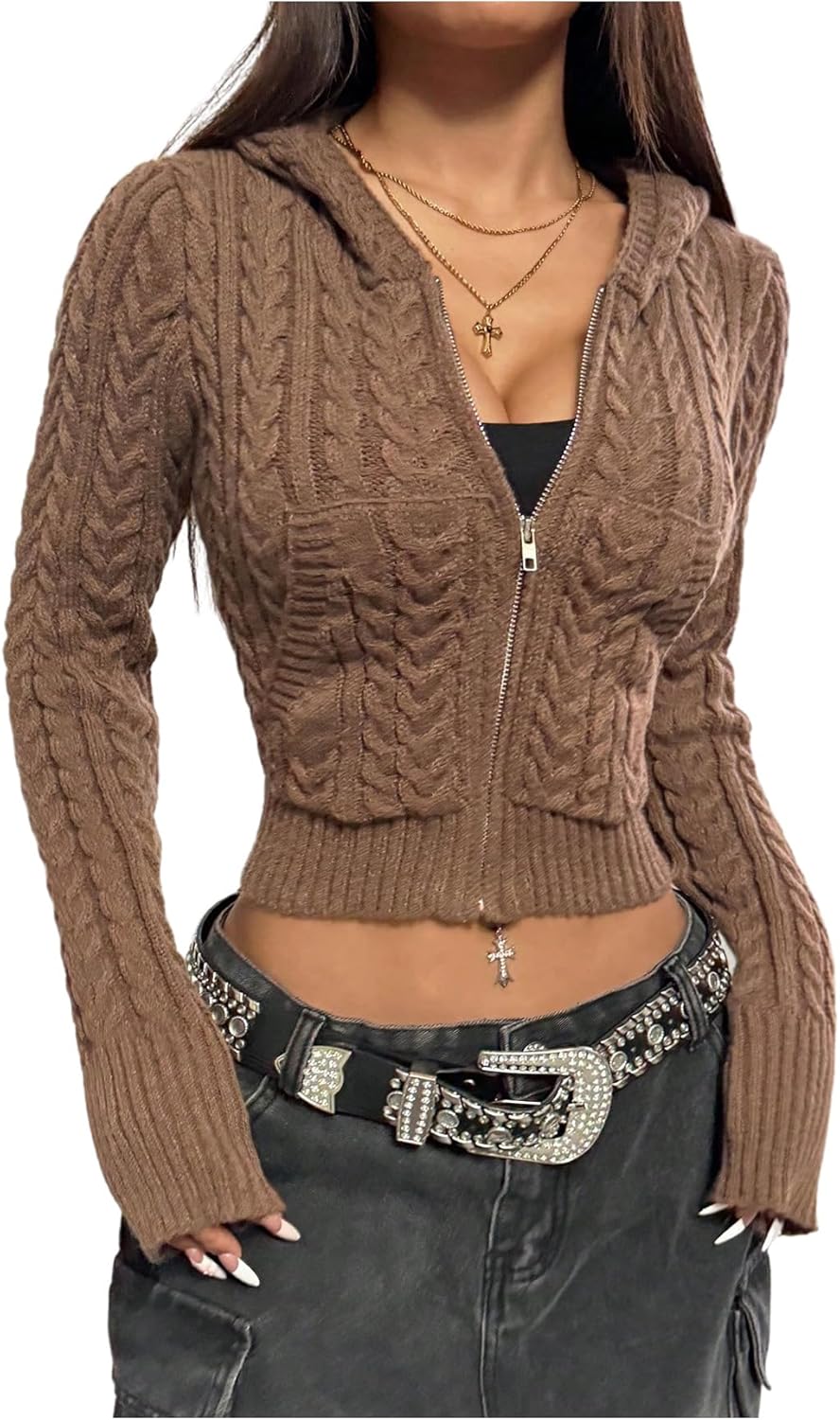 Verdusa Women's Zip Up Knit Crop Cardigan Long Sleeve Hooded Slim Fit Hoodies Outerwear with Pocket