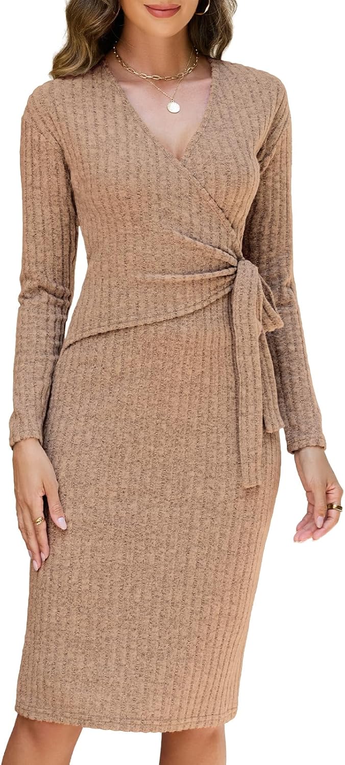 Lyrur Women's Long Sleeve Fall Dresses 2025 Trendy V Neck Tie Waist Wrap Midi Dress