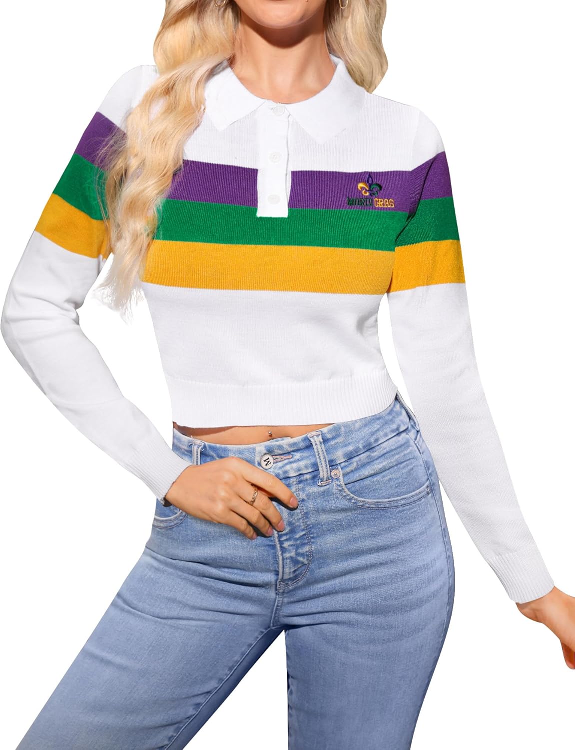 For G and PL Mardi Gras Women's Striped Polo Knit Cropped Slim Sweater Long Sleeves Top XS-XL