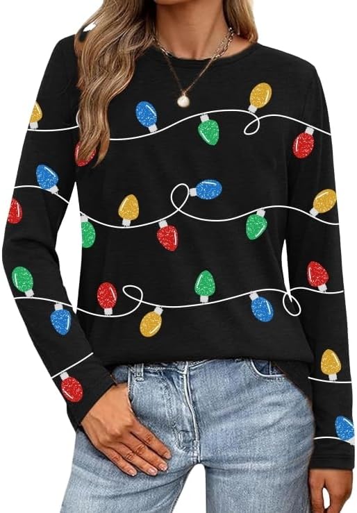 Christmas Shirts for Women Funny Christmas Hawaiian Long Sleeve Xmas Gifts Graphic Print Tee Tops