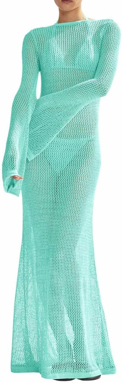 Saodimallsu Womens Crochet Cover Ups Long Sleeve Sexy Mesh Backless Knit Swimsuit Coverup Beach Maxi Dress
