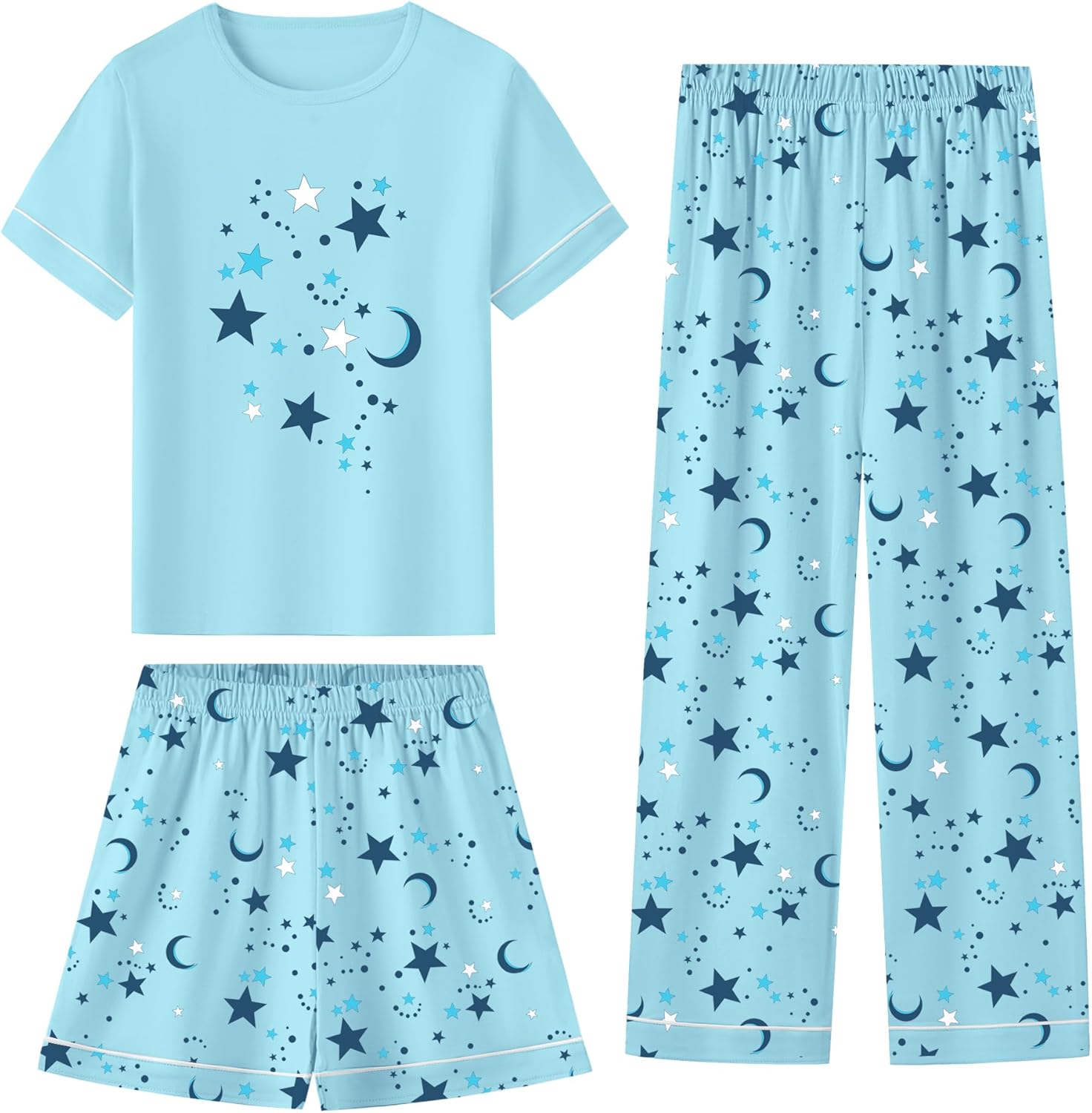 Umeyda Girls Pajamas Set, Cotton Pjs Cartoon Pattern 3PCS Sleepwear Lounge for Kids Size 5-14