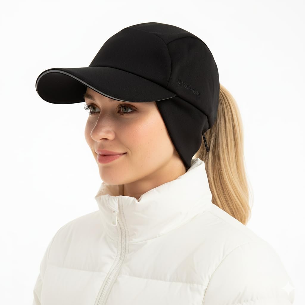 TOP-EX Waterproof Safety Reflective Ponytail Baseball Cap with Ear Flaps Lining for Women Running Outdoor Snow M/L