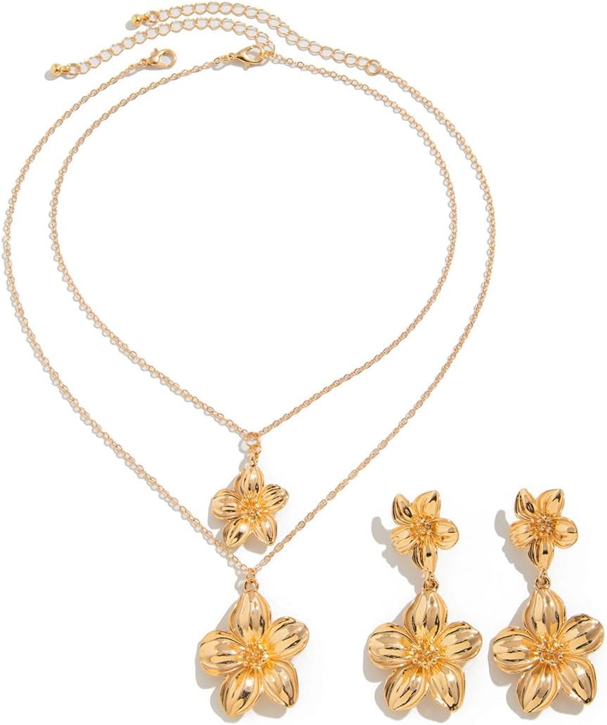 PLOUTOS Gold Tone Flower Statement Jewelry Set For Women, Layered Blossom Pendant Necklace With Matching Dangle Drop Earrings, Elegant Party Gift