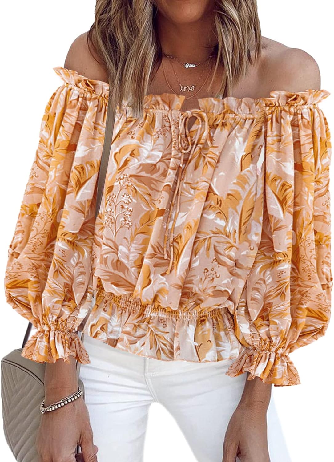 BLENCOT Summer Sexy Off Shoulder Tops for Women Boho Ruffle Sleeve Floral Chiffon Shirts Blouses