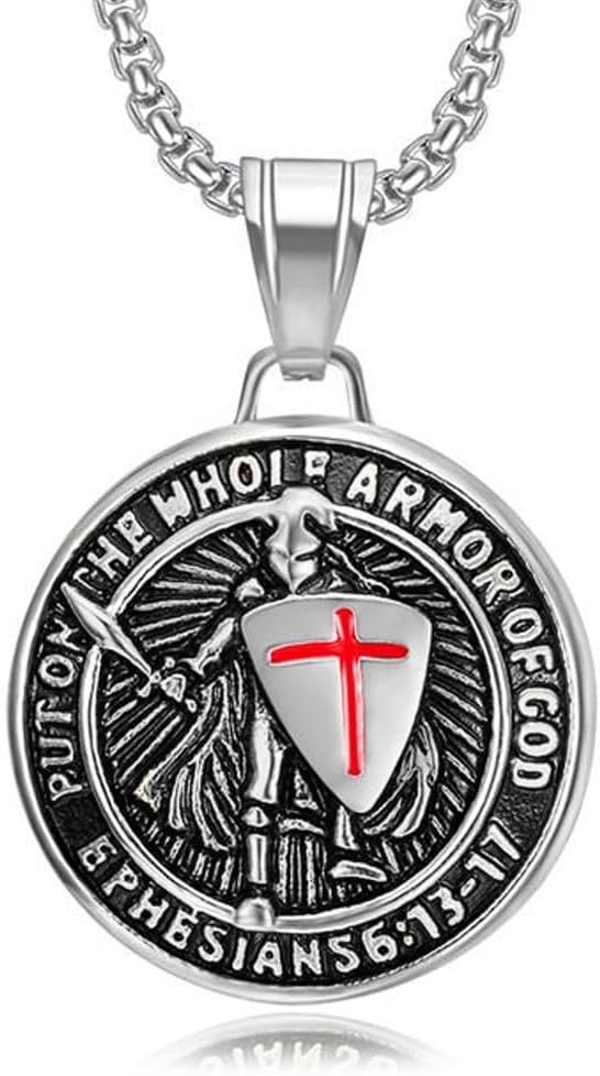 Armor of God Cross Pendant Necklace, Shield of Faith, Ephesians 6:16-17, Religious Amulet, Knights Templar Crusader, Stainless Steel 24" Chain