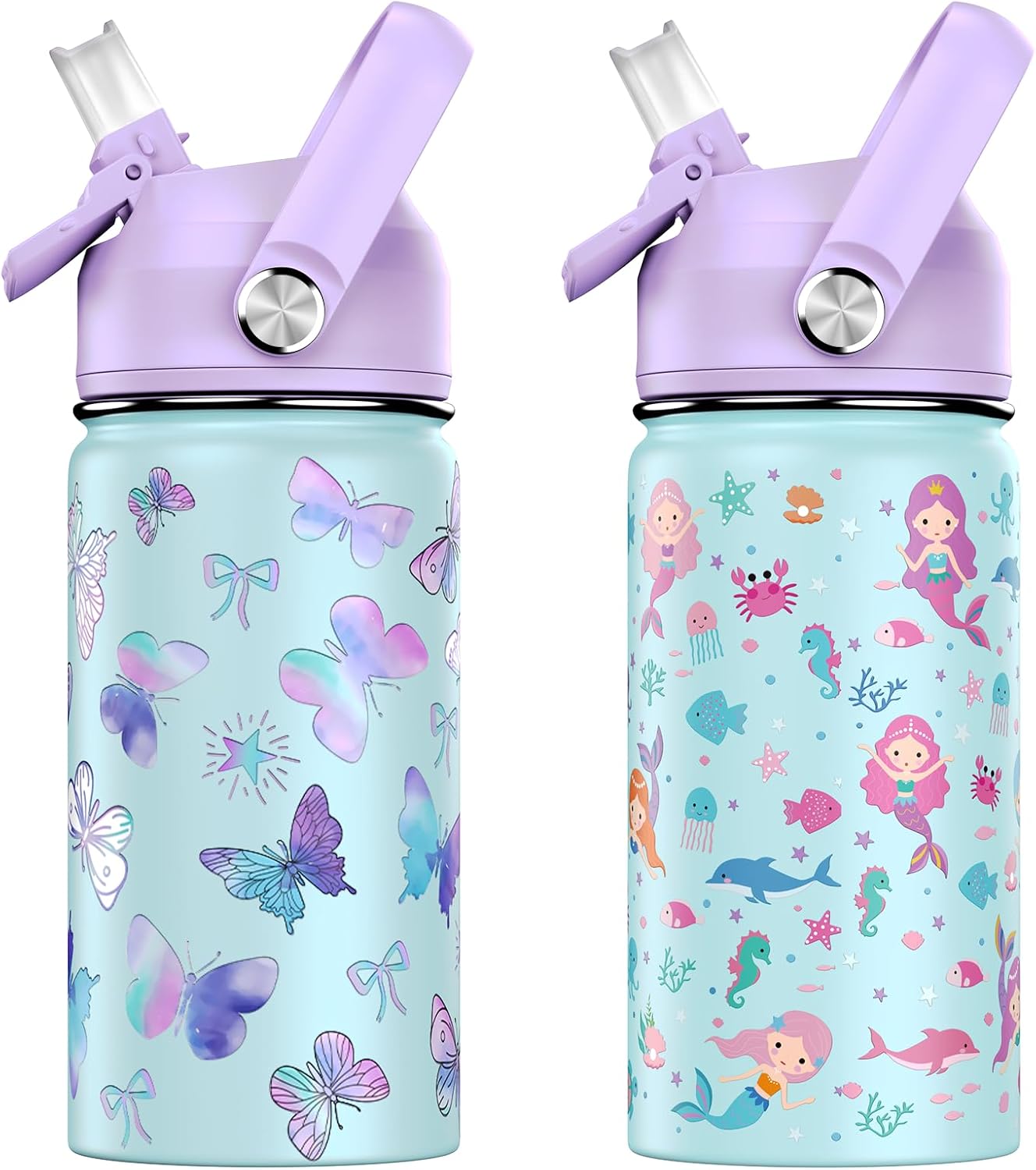14oz Kids Insulated Water Bottle with Straw Lid - 18/8 Stainless Steel Kid Cup Travel Tumbler Double Wall Vacuum Leak Proof Portable Toddler Water Bottle (Butterfly+Mermaid)
