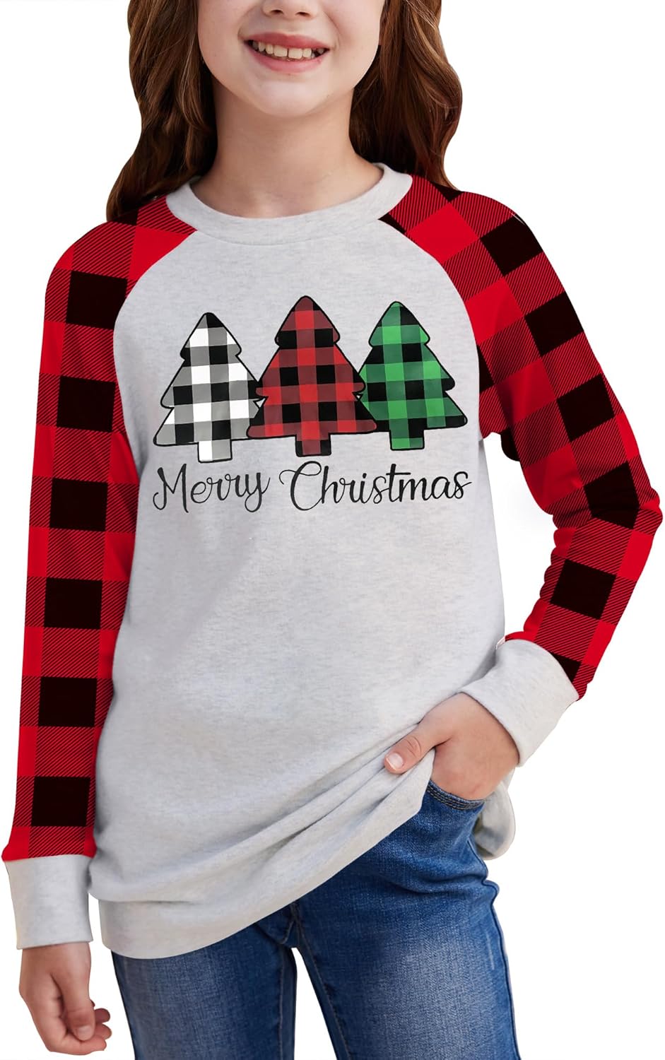 BesserBay Girl's Christmas Buffalo Plaid Raglan Top Funny Holiday Graphic Shirt 4-14 Years