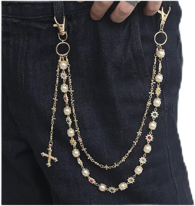 Layered Daisy Pearl Wallet Chain Rhinestone Flower Heart Cross Bag Charms Keychain Pants Jean Chains for Women Men