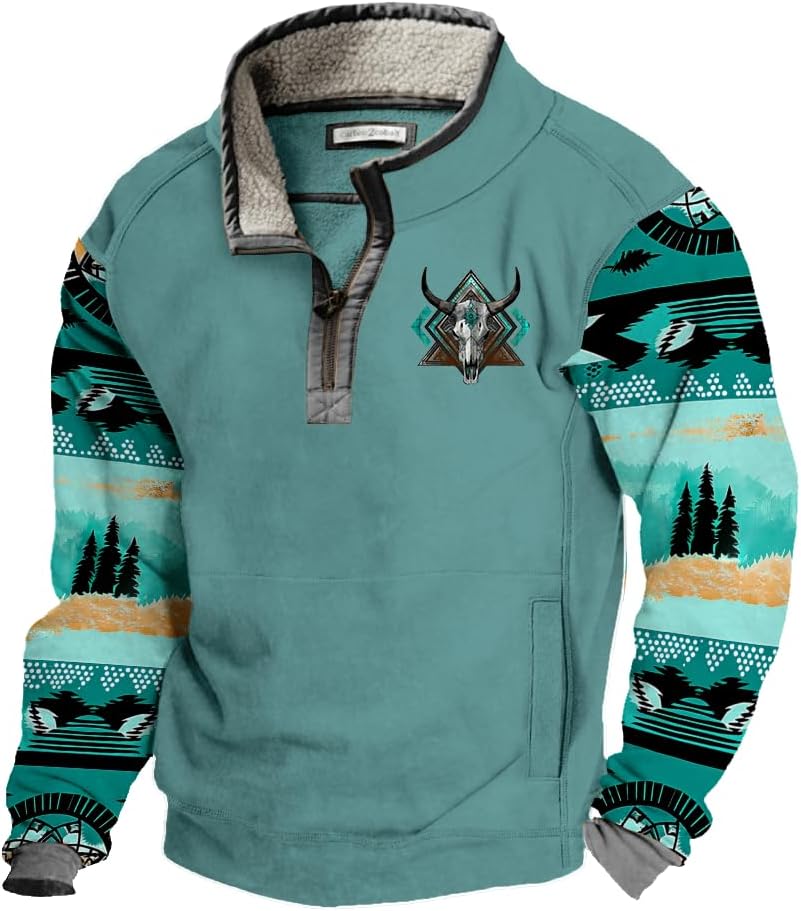 HOTYD Mens 1/4 Zip Fleece Stand Collar Sweatshirt Oversized Long Sleeve Aztec Graphic Pullover Western Jackets with Pockets