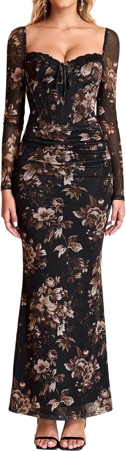 KUTUMAI Women Long Sleeve Lace Corset Formal Wedding Guest Dress Bodycon Ruched Mesh Cocktail Maxi Dresses