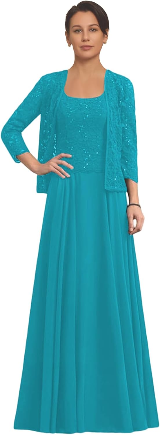 2 Piece Long Mother of The Bride Dress for Women 3/4 Sleeve Chiffon A Line Sequins Laces Formal Evening Dresses with Jacket
