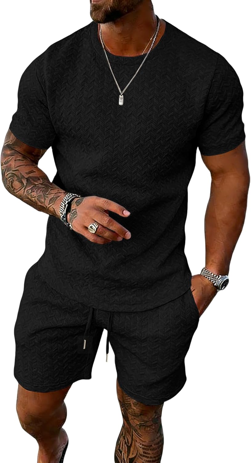 UOUA Mens Summer Outfits 2 Piece Short Set Casual Track Suits Matching Crew Neck Shirt and Vacation Shorts