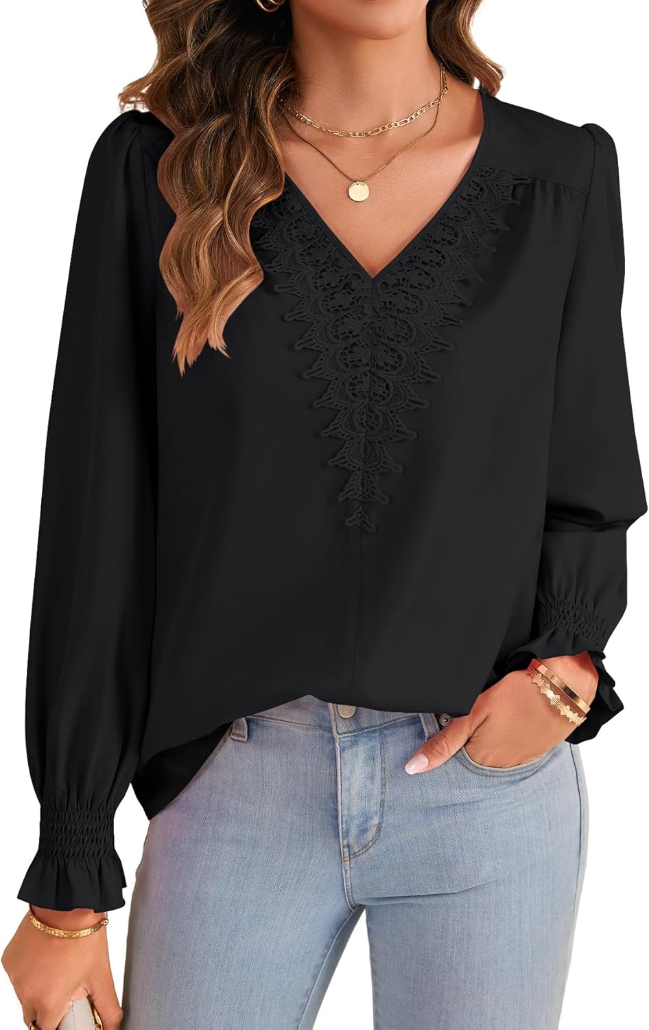 Vrtige Women's Lace Trim V Neck Lantern Long Sleeve Elegant Business Office Blouse Shirt