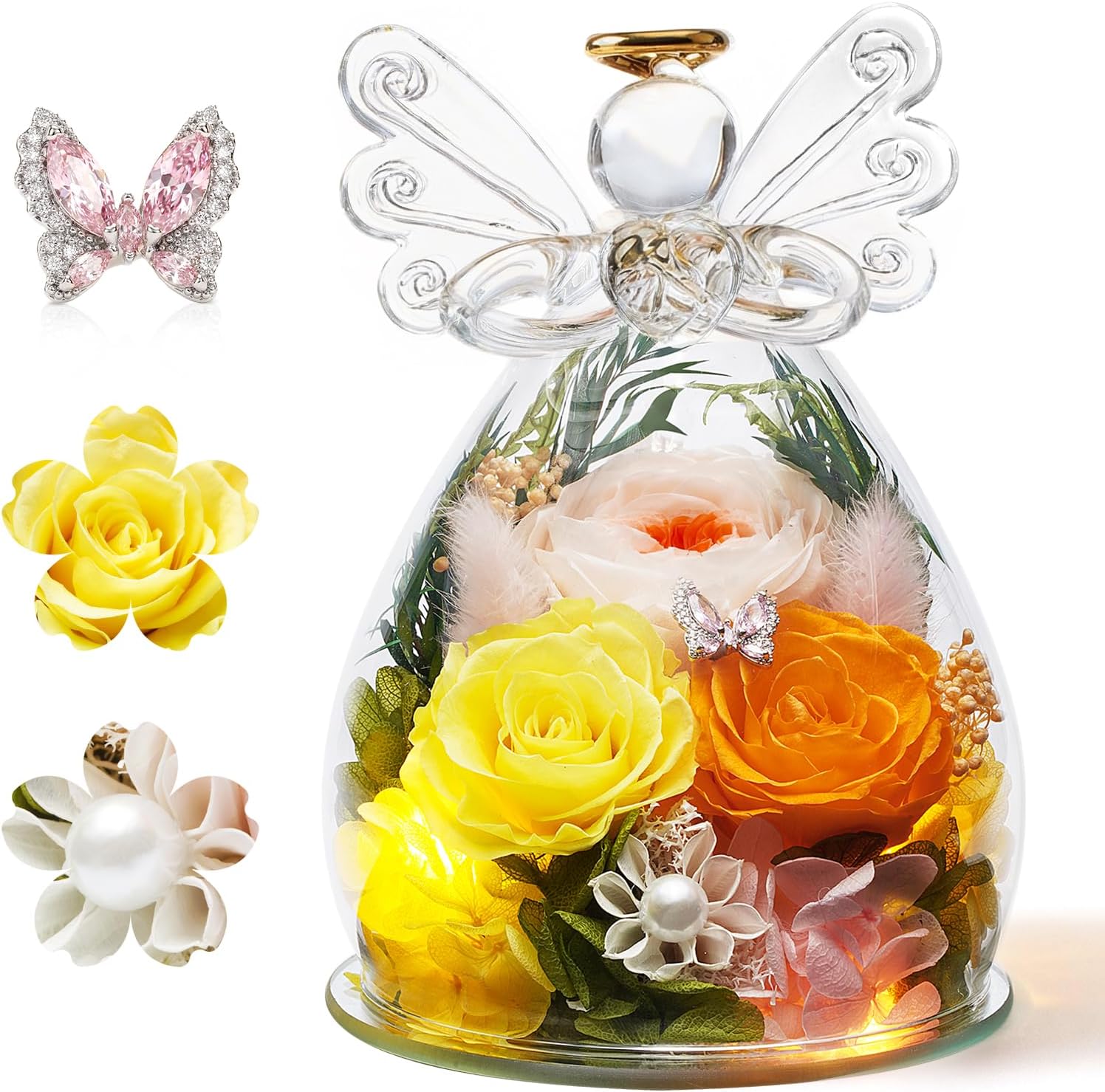 - 【100% Fresh Rose Flowers Last 2-3 Years】Our premium Preserved Rose Angel features 3 handpicked pink, orange & champagne roses—expertly curated by master florists with airy dream grass, hydrangea and star-shaped dried flowers for rich layered depth. Adorned with a sparkling rhinestone-inlaid butterfly & pearl accents, it boasts graceful, vivid natural beauty with everlasting blooms. An exquisite tasteful gifts for her. This timeless preserved floral arrangement is the perfect luxury gift to spoil her on Valentine’s Day, anniversaries, or just because