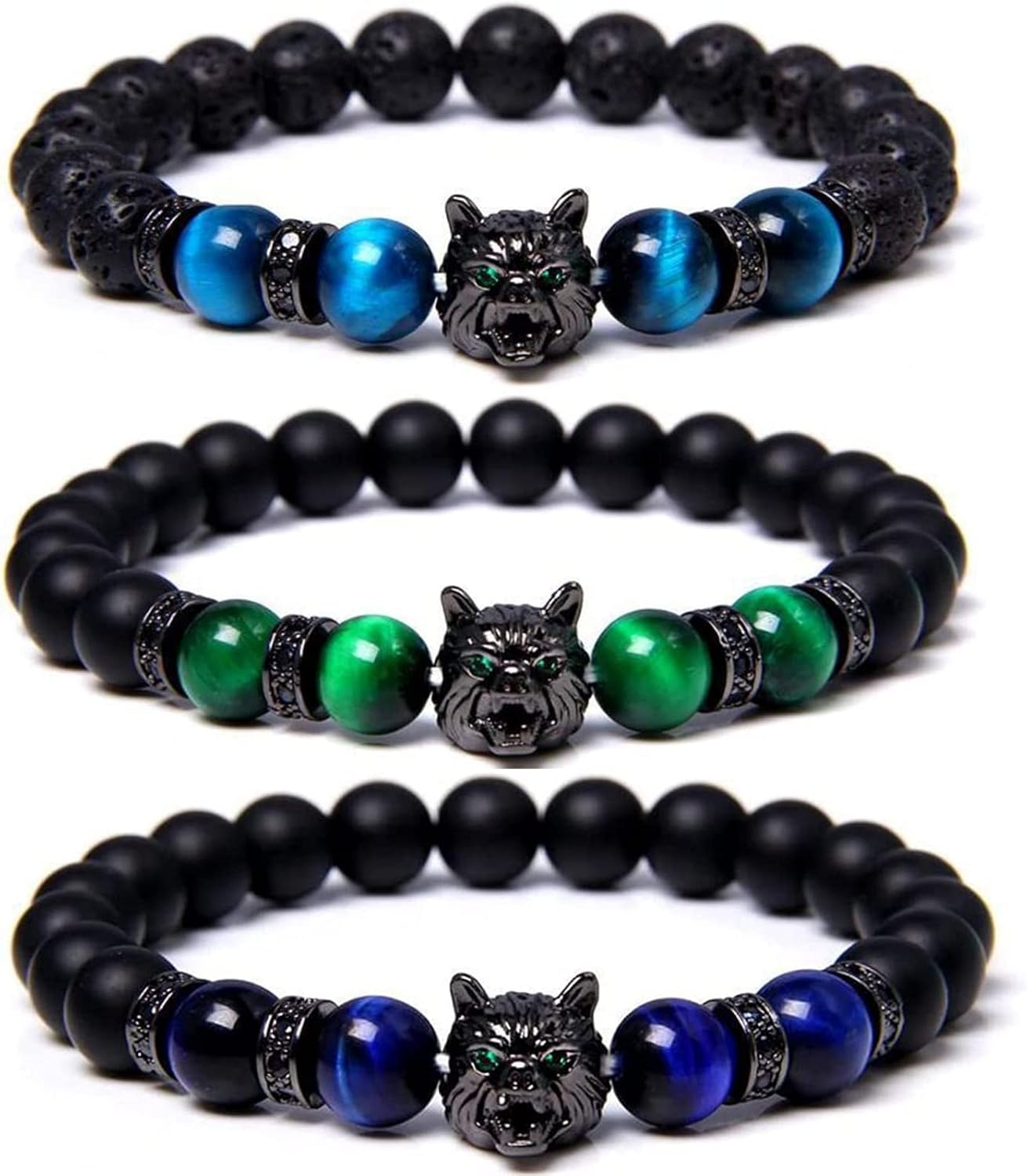 3Pcs Save A Wolf Bracelet,Wolf Head Lava Rock Bracelet,Healing Crystal Stress Relief Anti Anxiety Energy Stone Beaded Bracelet,Adjustable Bracelet for Men (Set)