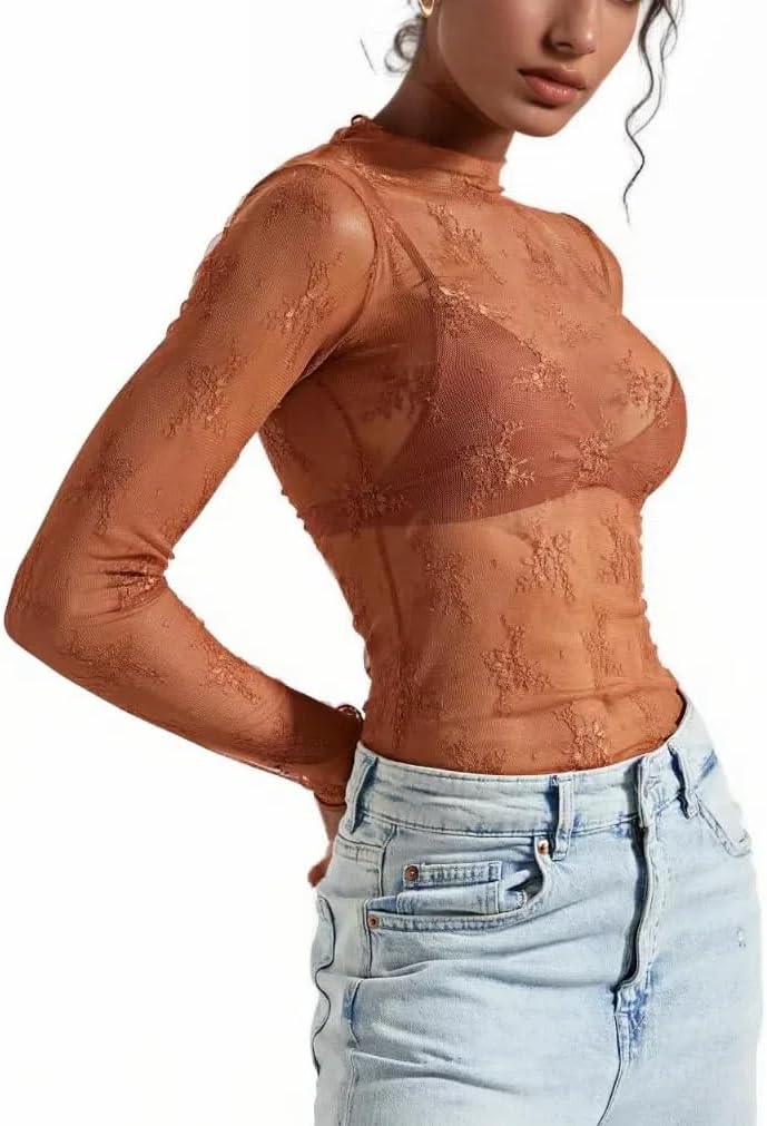 Womens Lace Top Long Sleeve Mesh Tops for Women Mock Neck Floral Sheer See Through Shirts for Party Club Casual Brown