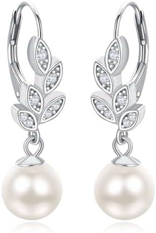 Pearl Dangle Earrings for Women - 925 Sterling Silver Rhodium Plated Drop Earrings Leaf Cubic Zirconia Earrings 8mm White Pearl Statement Drop Earrings Gifts for Brides Mom