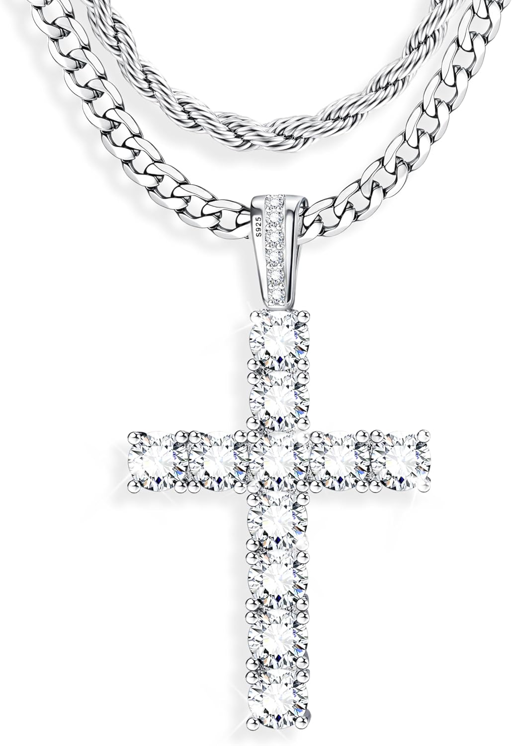925 Sterling Silver Cross Necklace Men - CZ Cross Pendant Layered Necklaces Waterproof Stainless Steel Cuban Link Rope Chain Silver Necklace Stack Jewelry with Gift Box 16-30 Inches