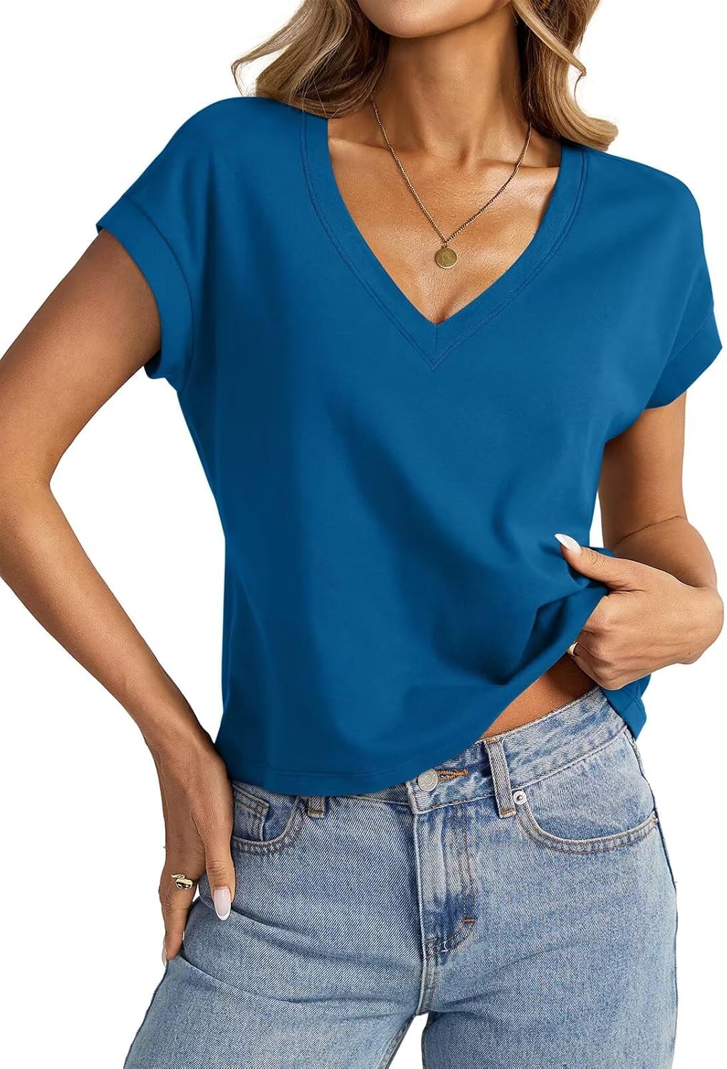 Womens Cap Sleeve Crop Tops Cotton V Neck T Shirt Boxy Loose Fit Short Sleeves Tee Summer Fashion Clothes 2026