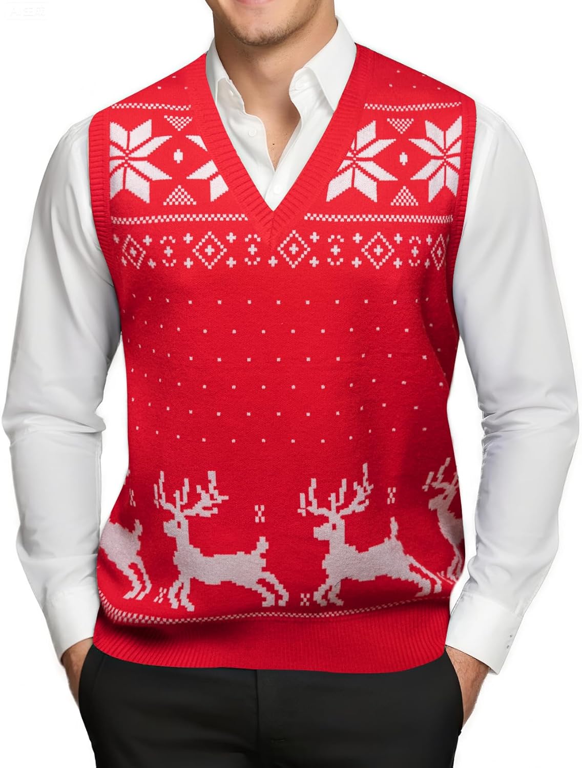 Barry.Wang Mens Christmas Sweater Vest Red/Green Ugly Xmas Reindeer Snowflake Sleeveless Knitted Pullover Holiday Party