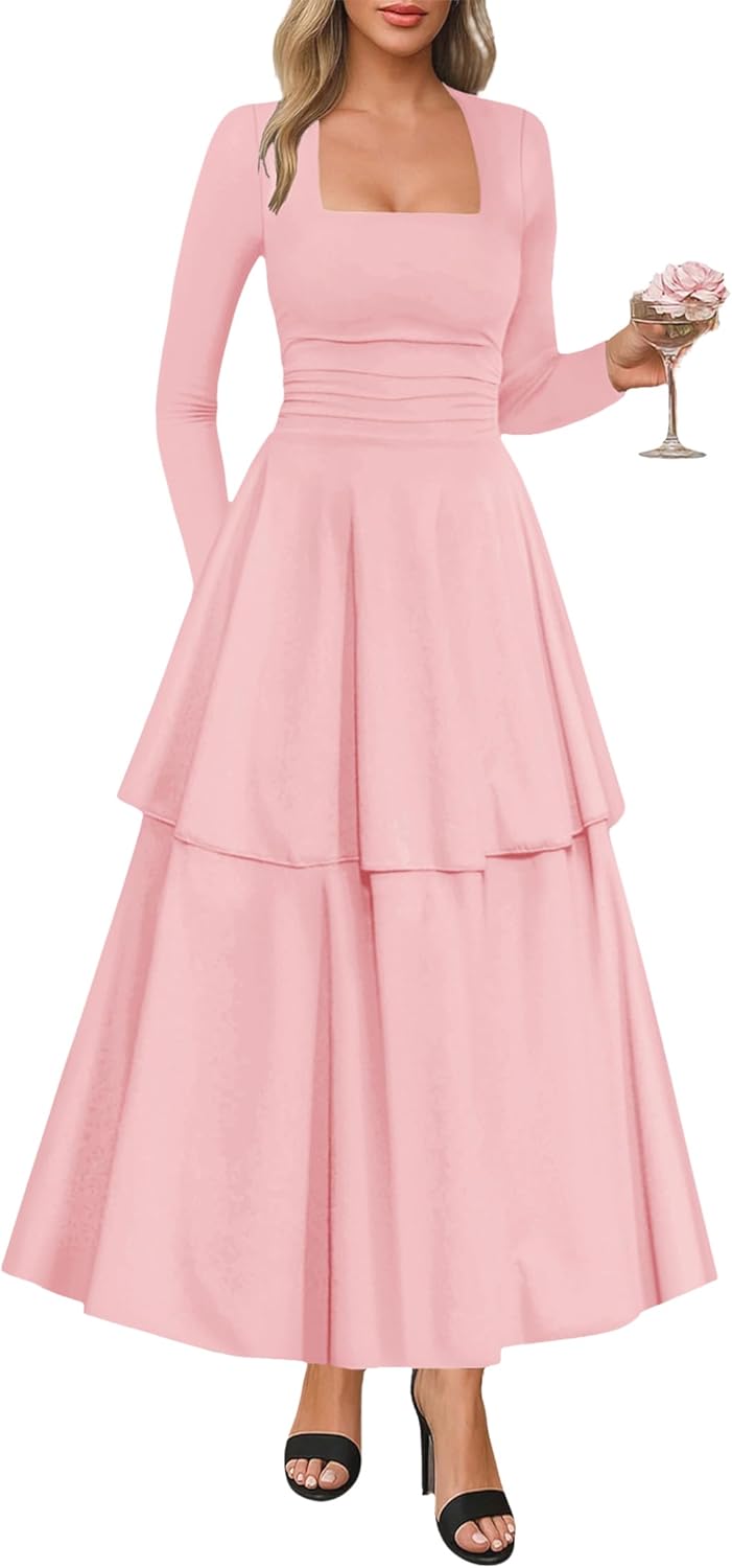 Lazysmile Women's Long Sleeve Fall Dresses Square Neck Ruched Waist Ruffle Hem Flowy Elegant Modest Boho Casual Maxi Dress